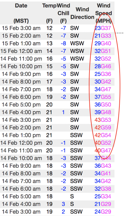 Above, a 24 hour data grab from Windy Peak (10,662') illustrating a bump in winds along the high ridges.