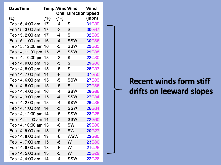 A 24 data dump from Windy Peak (10,662') shows Wednesday's increase in south and southwesterly winds, continuing into this morning.