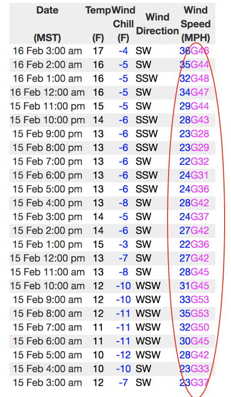 Above, a 24 hour data grab from Windy Peak (10,662') illustrating a bump in winds along the high ridges, especially after midnight.