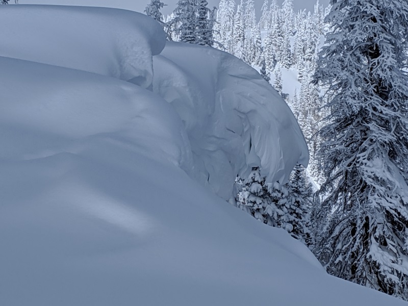 Don't let the light density, surface snow fool you into thinking that's all you're dealing with. Southerly winds blew for days prior to Friday nights light density blower pow, building layer, after layer, after layer of wind drifted snow. Now our wind slabs involve multiple storms, so they're more connected, and may break deeper than we might anticipate. While most prevalent on the leeward side of mid and upper elevation ridges, drifting also occurred around terrain features like chutes, gullies, and sub-ridges. In addition, recent winds cranked even down low near the trailheads, so expect to find fresh drifts in unusually low elevation terrain. In any case, today you'll want to look for and avoid any fat, rounded piece of snow, especially if it sounds hollow like a drum.