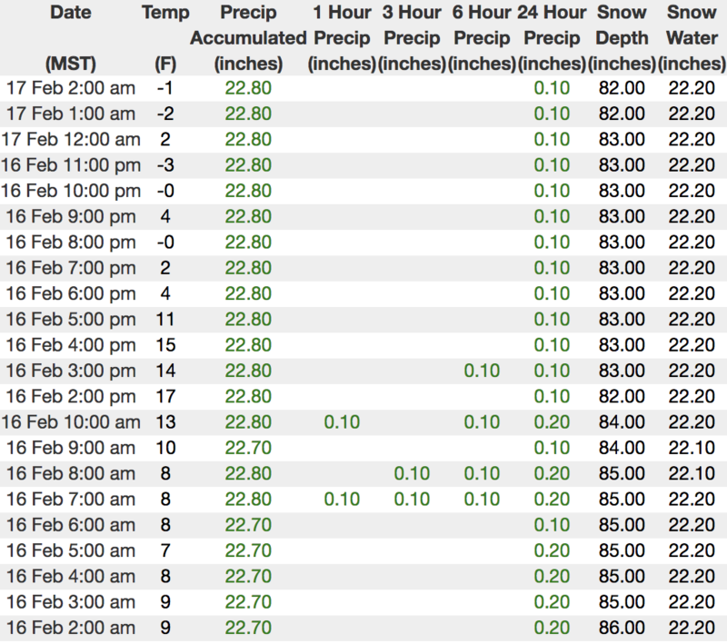 Above is hourly data from Trial Lake (9,945') and Windy Peak (10,662'). To view more regional weather stations click here.