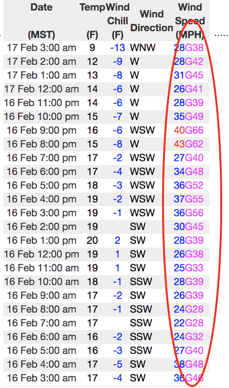Above, a 24 hour data grab from Windy Peak (10,662') illustrating a bump in winds along the high ridges, especially around 8:00-9:00 PM.