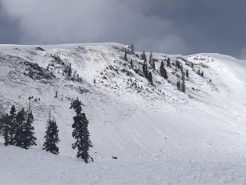 Cornice falls are triggering massive avalanches. Yesterday, a large piece of cornice peeled off this ridge, initiating the slide below, and stripping this slope of its entire winter snowpack. The end result is a large slide breaking 6'-10' deep, over a 1000' wide, and running a historically long distance.