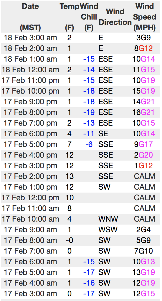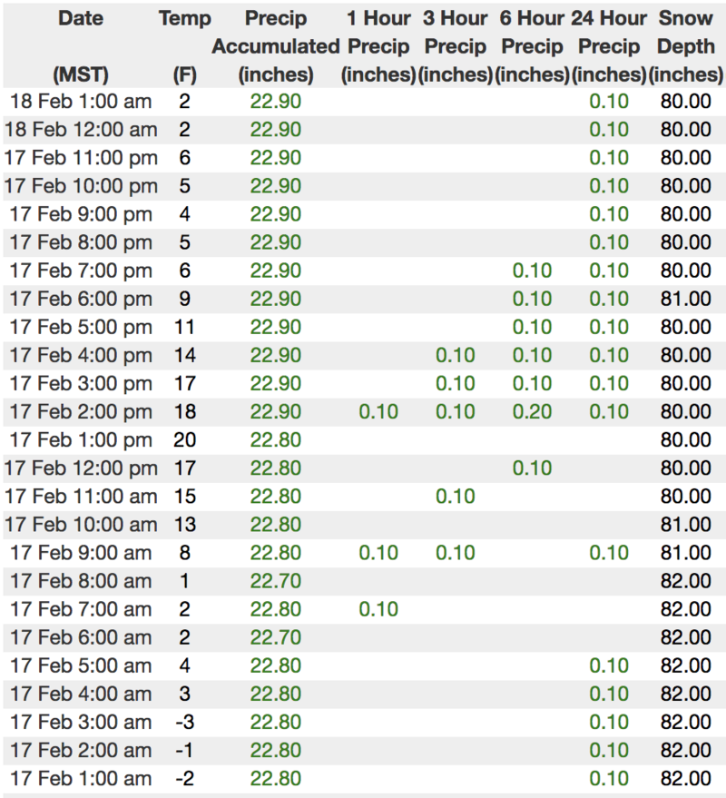 Above is hourly data from Trial Lake (9,945') and Windy Peak (10,662'). To view more regional weather stations click here.