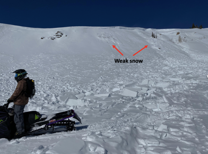 We can't see weak layers in the snowpack unless we take a minute, get our shovels out, and investigate... but the snowpack has an amazing memory and doesn't forget where these deficits are located. All we need to do is find one inconsistency (such a shallow, rocky section of the slope like in the image above), collapse the pack, and now we're staring down the barrel of a dangerous avalanche.