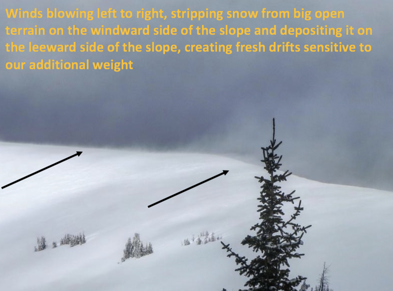 Third- steep, wind drifted terrain is particularly problematic, because today's avalanches could still potentially be triggered mid slope, low on the slope, or from a distance. All we need to do is collapse the slope (whoomph), and now we're staring down the barrel of a dangerous avalanche.