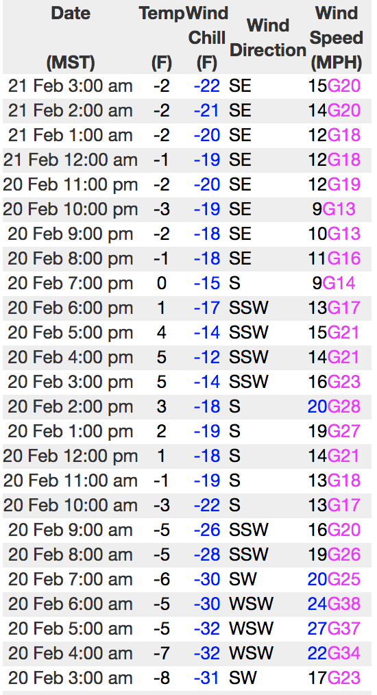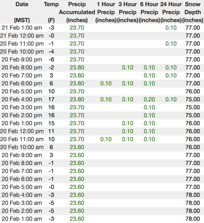 Above is hourly data from Trial Lake (9,945') and Windy Peak (10,662'). To view more regional weather stations click here.