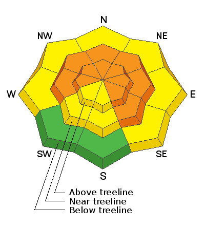 Today HUMAN TRIGGERED AVALANCHES ARE LIKELY and the avalanche danger is CONSIDERABLE near and above treeline in terrain facing west, north, east and southeast. Avalanches will be 2-5 feet deep and hundreds of feet wide.