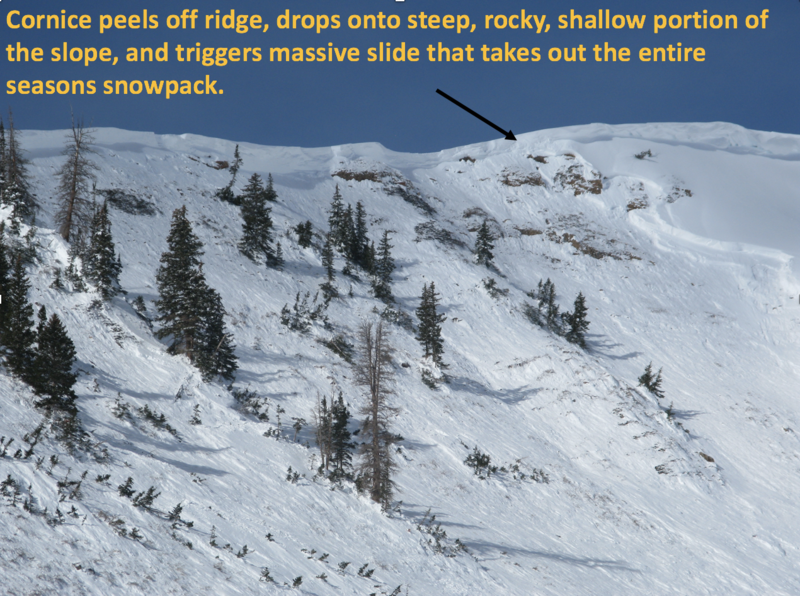 This winters storms have been busy at work creating layers of cornice that may break back further than you might expect. And remember- several large, recent avalanches have been triggered with cornice fall. You definitely wanna give these large, unpredictable pieces of snow a wide berth and not ruin someones day below by inadvertently knocking a boxcar size piece of snow down on them.