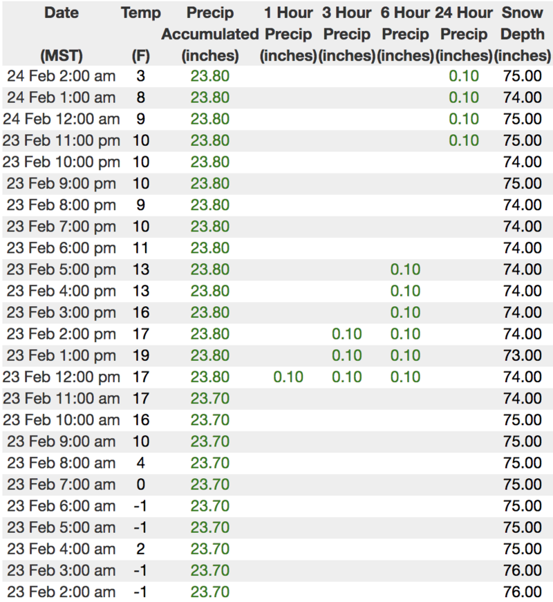 Above is hourly data from Trial Lake (9,945') and Windy Peak (10,662'). To view more regional weather stations click here.