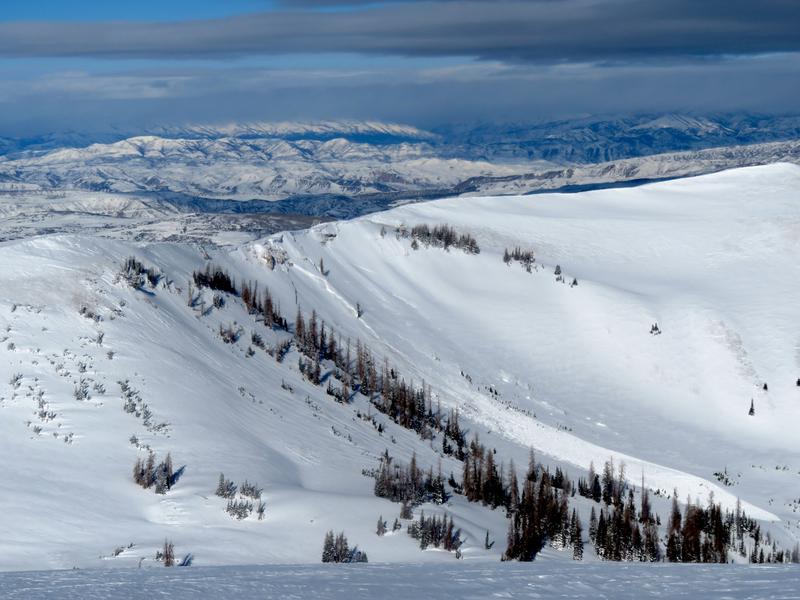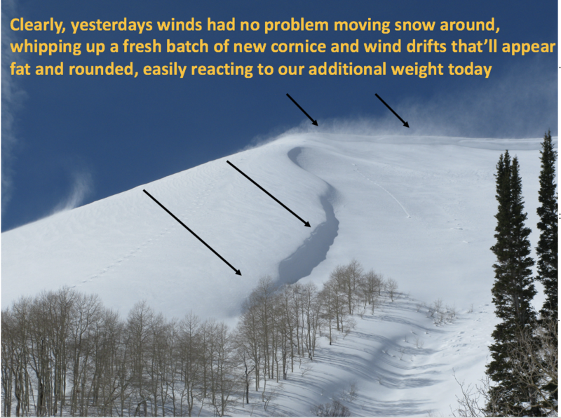 After nearly a week of hardly any wind, yesterday was a good reminder of how quickly Uinta winds can change the landscape, ruin vast amounts of soft snow, and whip up fresh drifts sensitive to our additional weight. While today's wind drifts are found mostly along the leeward side of mid and upper elevation ridges, like in the image above, drifts also formed around terrain features like chutes or gullies. In any case, today you'll want to look for and avoid any fat, rounded piece of snow, especially if it sounds hollow like a drum.