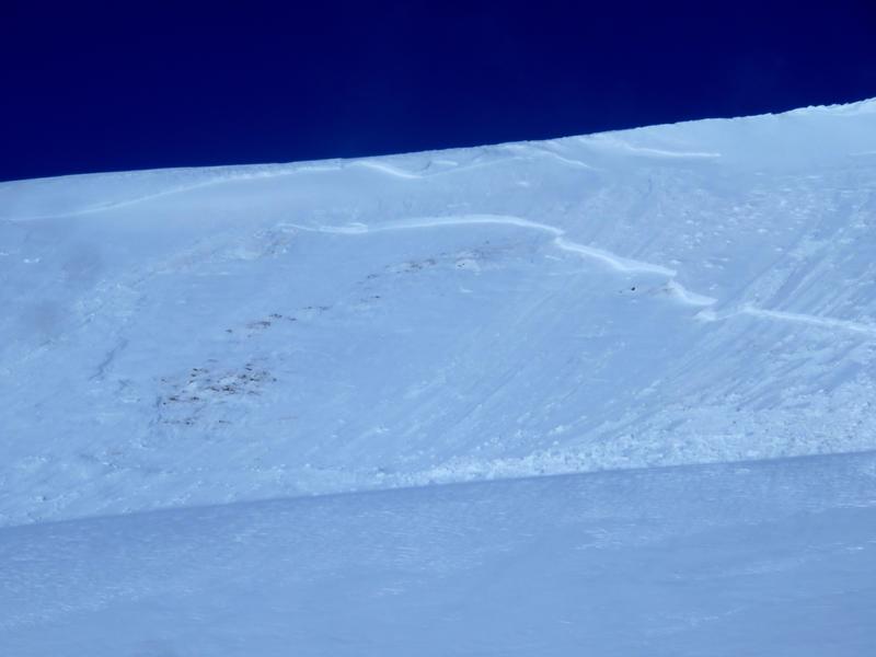 The top image is a slide triggered yesterday with a good thump on an upper elevation, southerly facing slope which has remained shallow and weak this season. No es bueno.