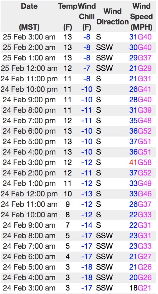 Above is hourly data from Trial Lake (9,945') and Windy Peak (10,662'). To view more regional weather stations click here.