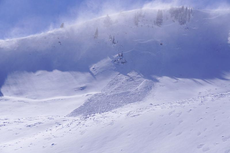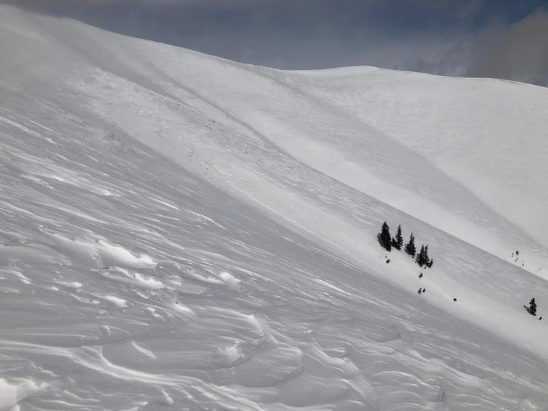 After nearly a week of hardly any wind, we've gotten a good reminder that wind was invented in the Uintas and it can quickly change the landscape, ruin vast amounts of soft snow, and whip up fresh drifts sensitive to our additional weight. While today's wind drifts are found mostly along the leeward side of mid and upper elevation ridges, like in the image above, drifts also formed around terrain features like chutes or gullies. In any case, today you'll want to look for and avoid any fat, rounded piece of snow, especially if it sounds hollow like a drum. (Earle image)
