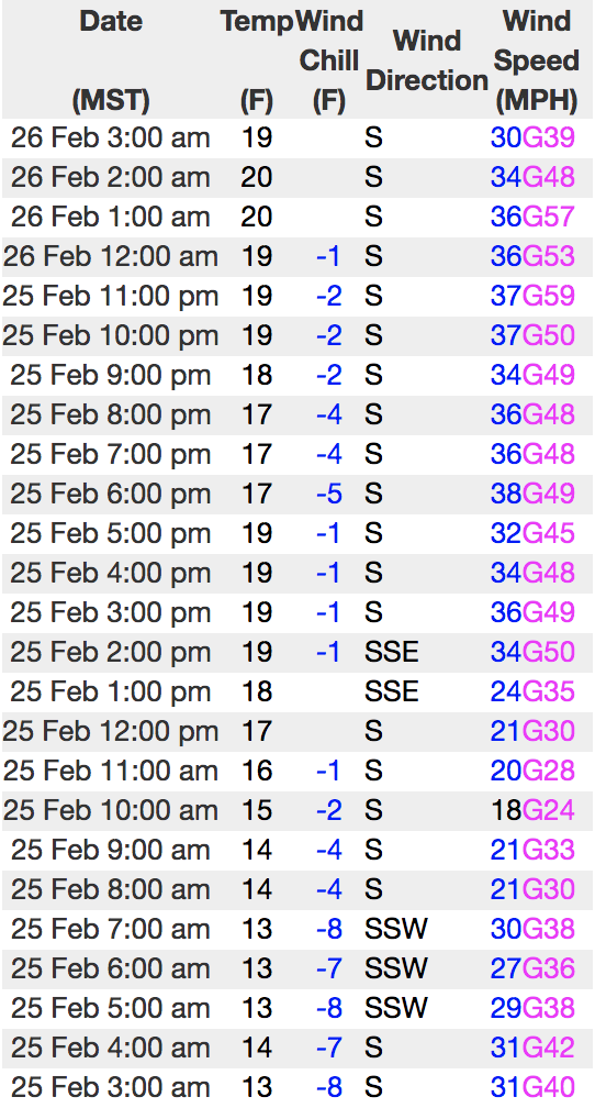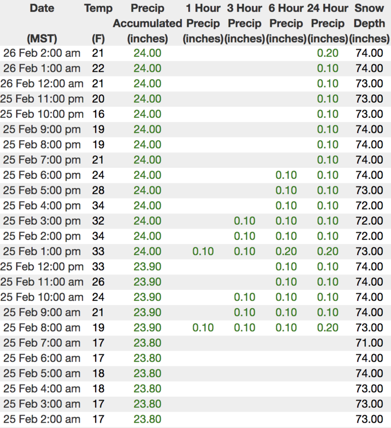 Above is hourly data from Trial Lake (9,945') and Windy Peak (10,662'). To view more regional weather stations click here.
