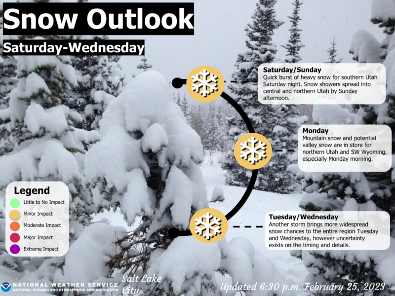 Most likely periods of heaviest snowfall are Sunday night, Tuesday morning and Wednesday morning.