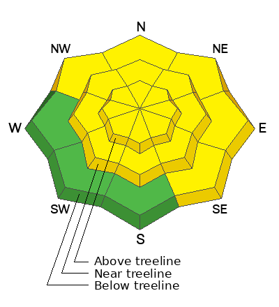 Overall the avalanche danger is MODERATE today, but that doesn't tell the whole story. Shallow slabs of wind drifted snow are possible above treeline while huge avalanches breaking at the ground may occur on isolated slopes in steep and rocky terrain. NOTE - if snowfall and winds pick up sooner than expected the danger could rise to CONSIDERABLE above treeline.