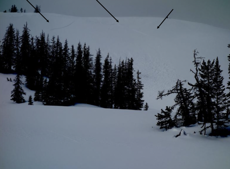 The top image is a slide triggered Sunday with a good thump on an upper elevation, southerly facing slope which has remained shallow and weak this season. No es bueno.
