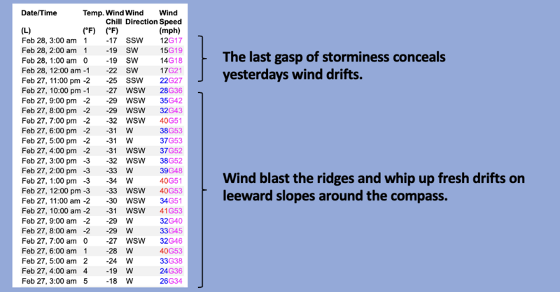 A 24 hour data dump from Windy Peak (10,662') illustrates recent wind and temperature trends.