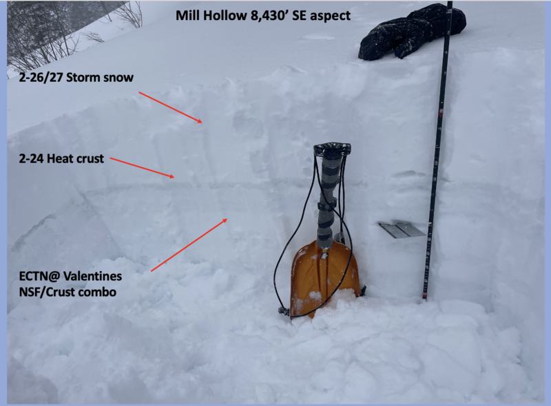 Here's where it gets tricky... on the south half of the compass, sunny slopes have a thin layer of facets on top of a crust that was buried 12"-18" deep on Valentine's day. This layer delivered two avalanches in Mill Hollow last Tuesday and Wednesday. In American Fork Canyon on Thursday, this layer produced a huge avalanche and a close call.