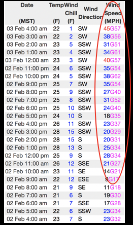 A 24 hour data dump from Lofty Lake Peak clearly shows a bump in the winds beginning in earnest right around dinnertime last night.