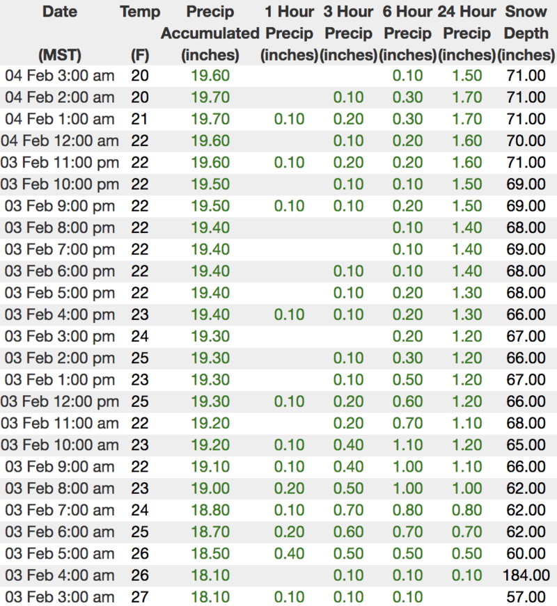 Above is hourly data from Trial Lake (9,945') and Windy Peak (10,662'). To view more regional weather stations click here.
