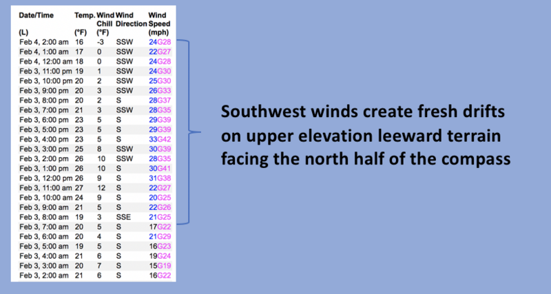 Nowcast- Skies clear in the wake of a weak cold front that slid through the region overnight, knocking temperatures into the mid teens. Southwest winds are beginning to taper, but remain obnoxious, blowing in the mid 20's near the high ridges. Our big open alpine terrain took a hit yesterday, and yup, it's been a minute or two since our last storm. But don't let your heart be troubled... soft, recycled powder is still found in wind sheltered terrain facing the north half of the compass.