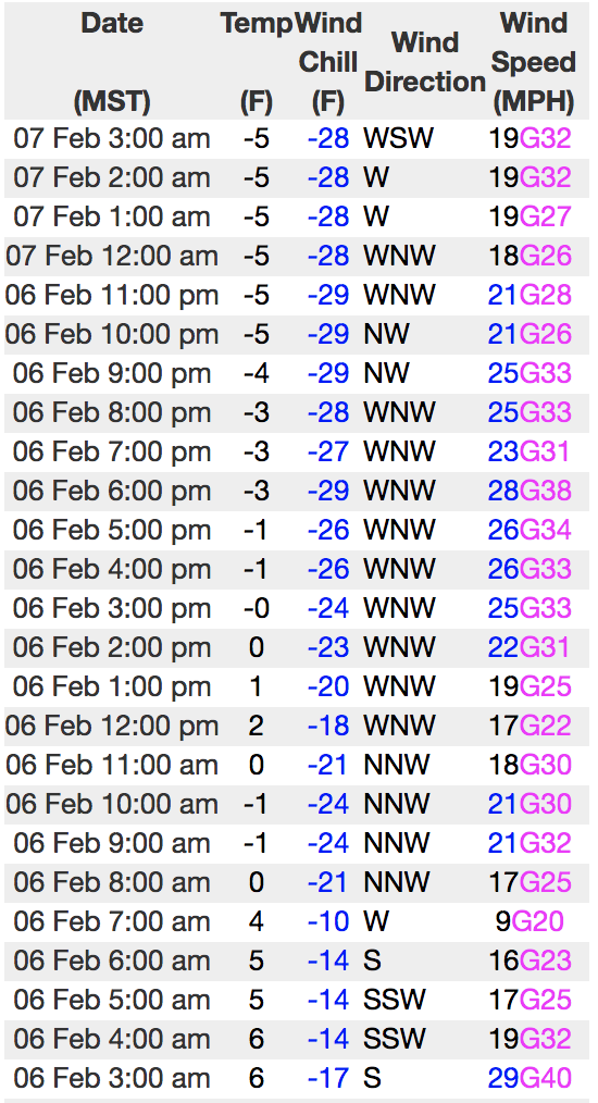 Above is hourly data from Trial Lake (9,945') and Windy Peak (10,662'). To view more regional weather stations click here.