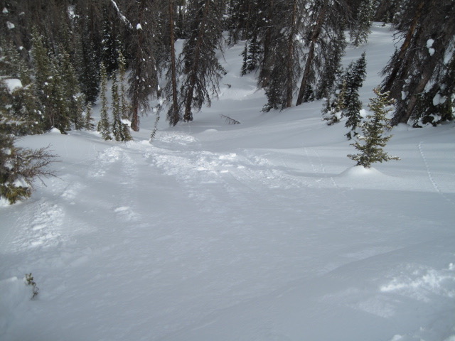 Shallow fresh drifts breaking about a foot deep, both Ted and I found similar conditions along the leeward side of upper elevation ridges yesterday. (Scroggin image)