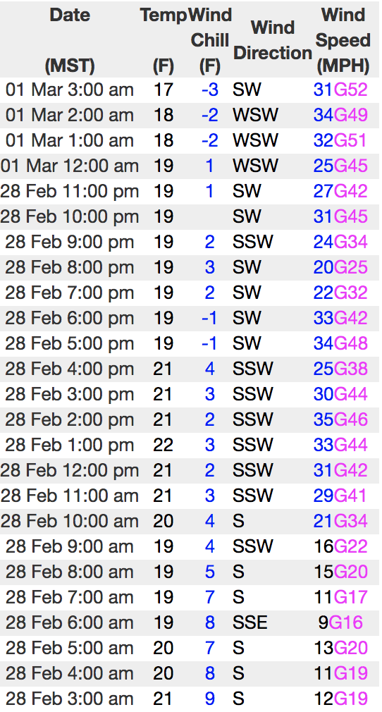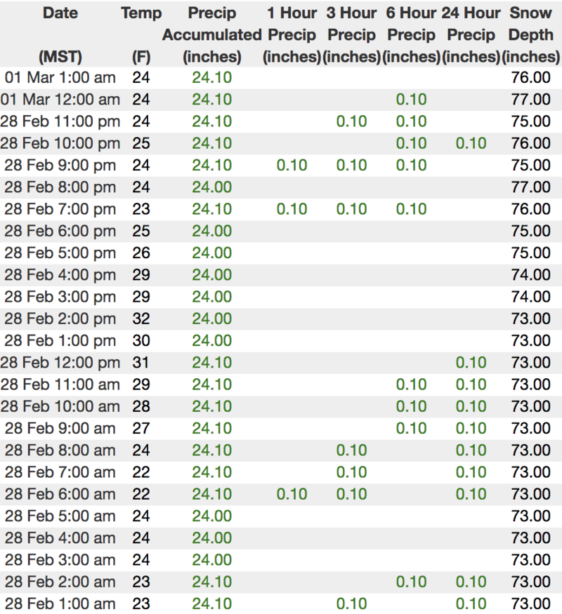 Above is hourly data from Trial Lake (9,945') and Windy Peak (10,662'). To view more regional weather stations click here.
