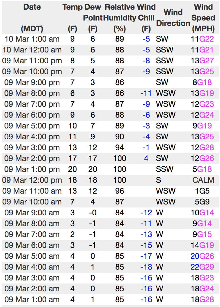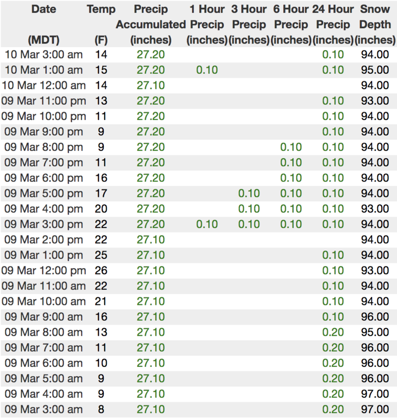 Above is hourly data from Trial Lake (9,945') and Windy Peak (10,662'). To view more regional weather stations click here.
