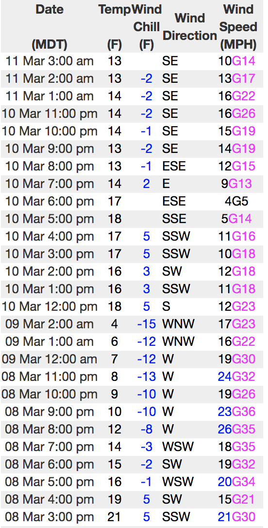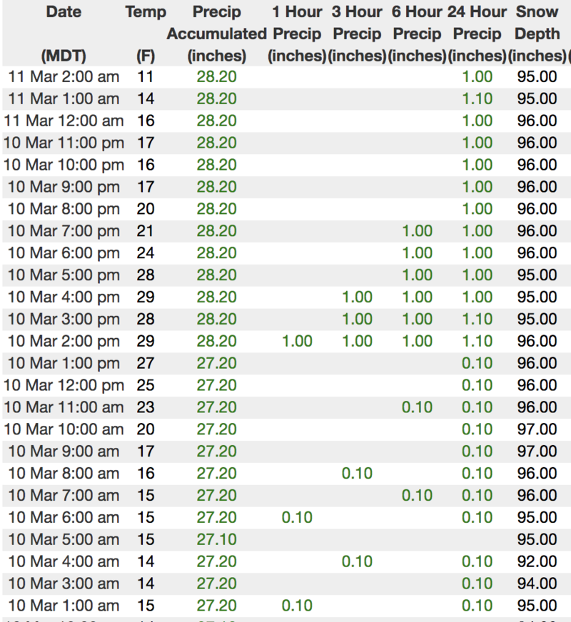 Above is hourly data from Trial Lake (9,945') and Windy Peak (10,662'). To view more regional weather stations click here.