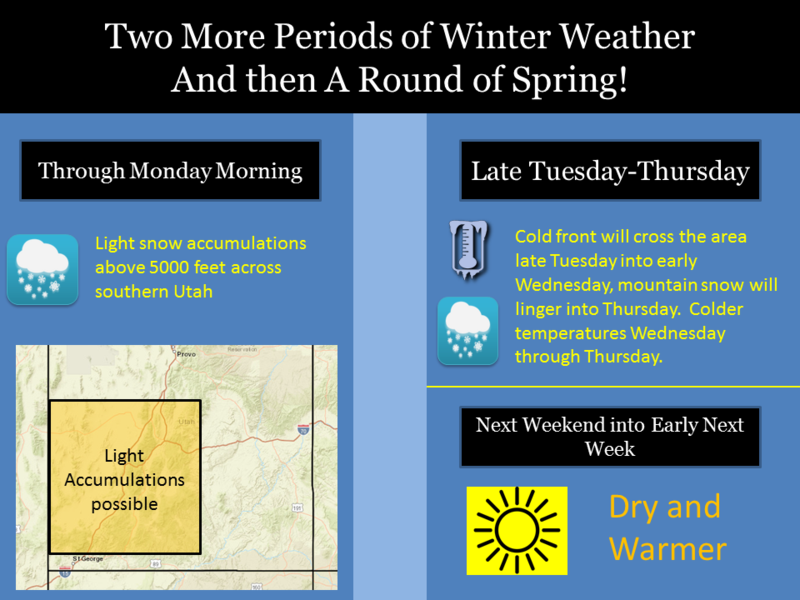 A storm system working its way south of the area produces mostly cloudy skies for us, along with a chance of snow showers throughout the day. High temperatures rise into the low and mid 30's and winds remain light, blowing less than 20 mph along the ridges. The next storm system impacts the area Tuesday night with snow lingering into Wednesday.