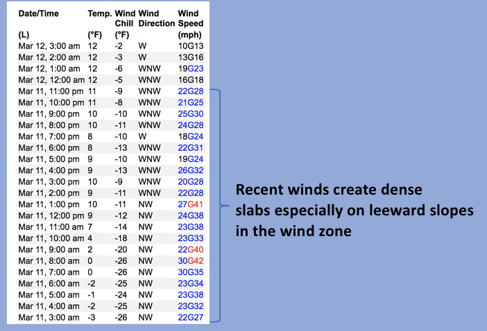 Above is a 24 hour data dump from Windy Peak (10,661') illustrating recent wind trends.