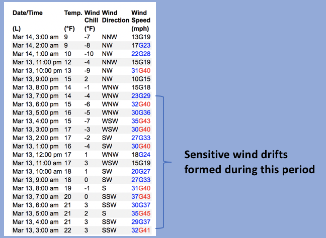 Above is a 24 hour data dump form Windy Peak (10,661') showing a long stretch of robust winds.