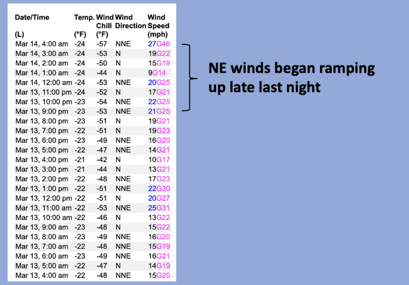 Lofty Lake Peak (11,186') is one of the first peaks on the receiving end of northeasterly winds. (disregard temps and windchill... they're whacked)