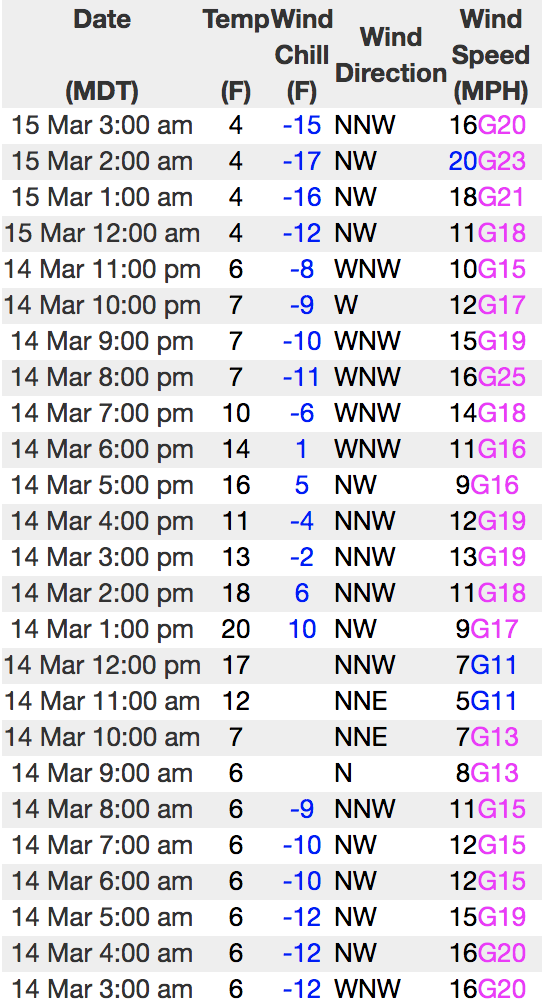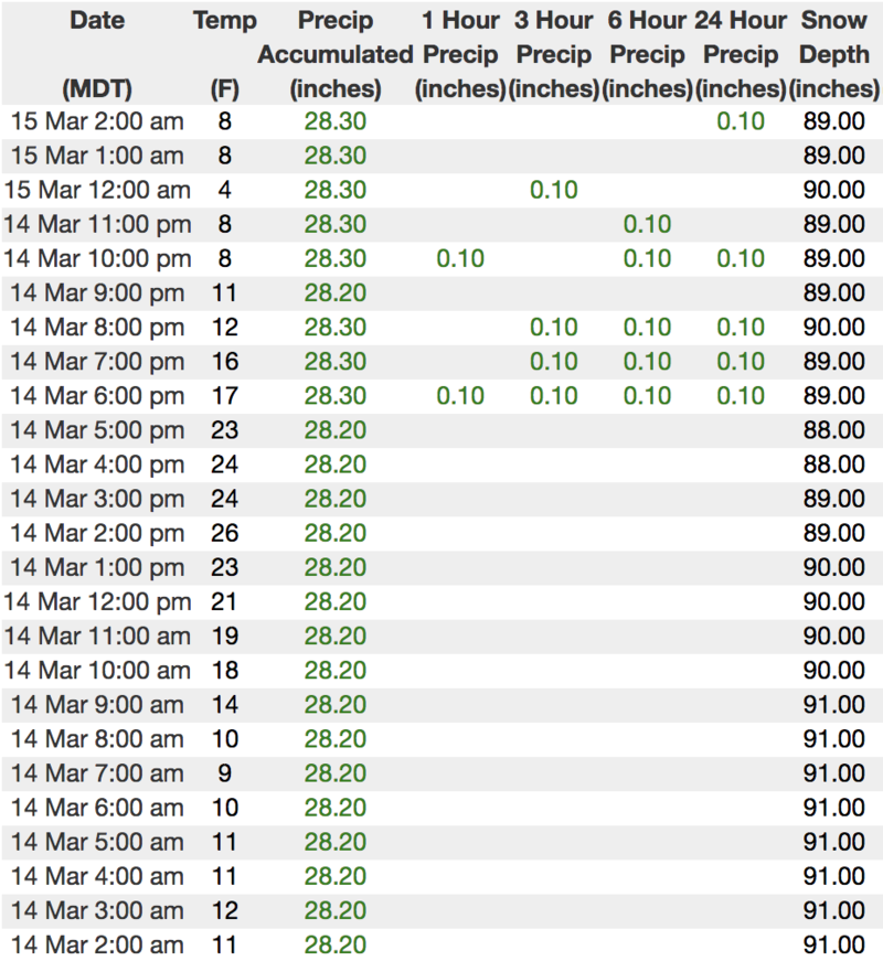 Above is hourly data from Trial Lake (9,945') and Windy Peak (10,662'). To view more regional weather stations click here.