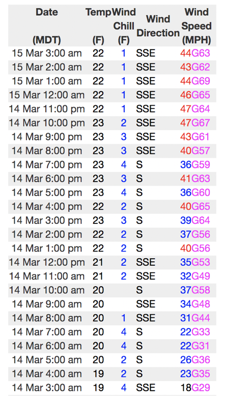 24 hour wind data from Windy Peak (10,662') illustrating recent ridgetop winds.