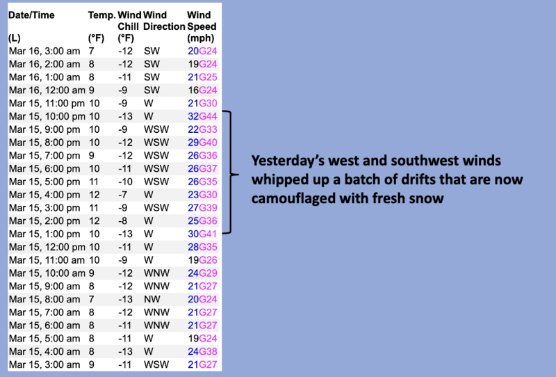 For today, CONSIDERABLE avalanche danger is found on upper elevation slopes, especially those facing the north half of the compass. In the windzone, at and above treeline, human-triggered fresh drifts and storm snow avalanches are LIKELY. Heads up... steep, rocky terrain with a shallow snowpack fits the bill for slopes that can produce an avalanche that fails on weak, midpack snow, delivering a slide that breaks deeper and wider than we might expect.
