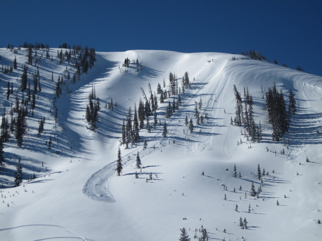 The image above shows steep upper elevation terrain in Moffit Basin, clearly showing what we're dealing with in the wind zone. A few lingering wind drifts formed earlier in the week lurk under Wednesday nights storm and may react to our additional weight. Limited to steep, leeward terrain in the wind zone and big enough to boss you around, look for and avoid fat, rounded pieces of snow that once triggered, may take you for an unexpected ride in steep, technical terrain.