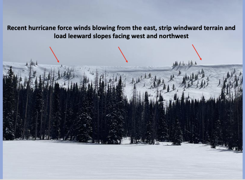 MODERATE avalanche danger exists at and above treeline, especially in the wind zone, where human triggered avalanches are POSSIBLE on steep, wind drifted slopes. Note to self... unusual easterly winds reshape the landscape, forming atypical drifting on slopes with a westerly component to their aspect.
