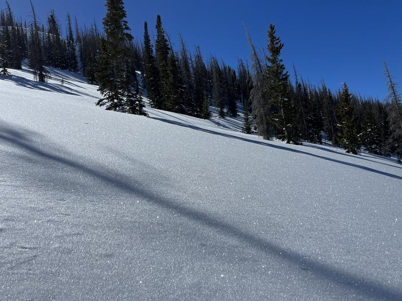 We know winds were invented in the western Uintas and rounding out the workweek, the range took pride in their patent. Winds nuked into the 50's and 60's along the high ridges from an unusual, east and northeast orientation... yeah, that's odd for us. As such, look for hard and mostly stubborn drifts in uncommon locations, especially on slopes with a westerly component to its aspect. While I suspect most drifting occurred on the leeward side of mid and upper elevation ridges, be on the lookout cross-loading in chutes and gullies and avoid any fat, rounded piece of snow, especially if it sounds hollow like a drum. Breaking at or below our skis, board, or sled today's main avalanche problem is easily managed with terrain choices. Lose the wind... you lose the problem.