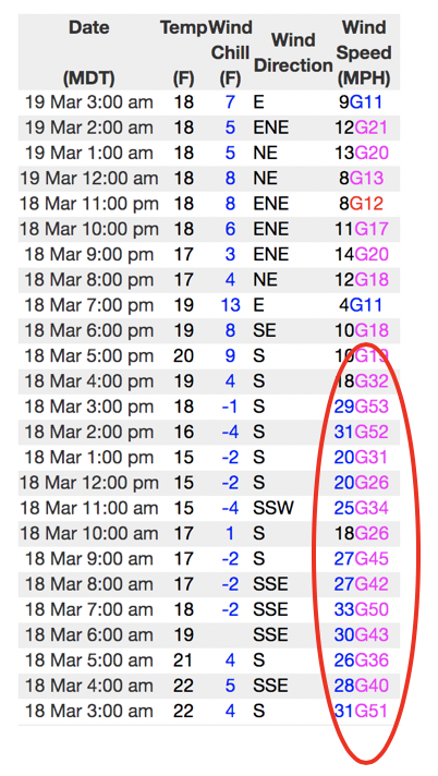24 hour data from Windy Peak (10,662') illustrating strong southerly winds tapering off late yesterday afternoon.