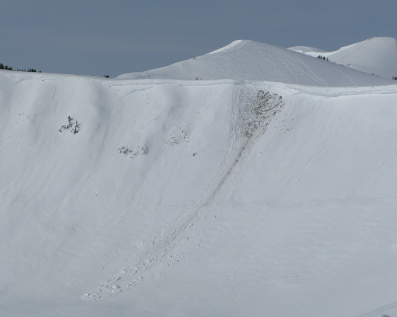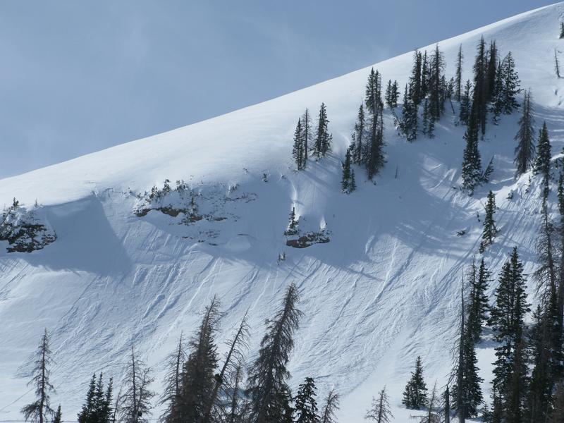 Occurring naturally, a piece of cornice peeled off this ridgeline in upper Weber Canyon sometime late Sunday afternoon. The bus sized piece of snow crashed onto the slope below, triggering a shallow wet slab which gouged into weak snow near the ground. Of note... a repeater, the snowpack was already shallow in this zone from an avalanche triggered earlier this year.