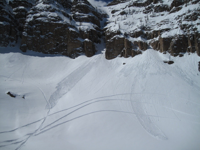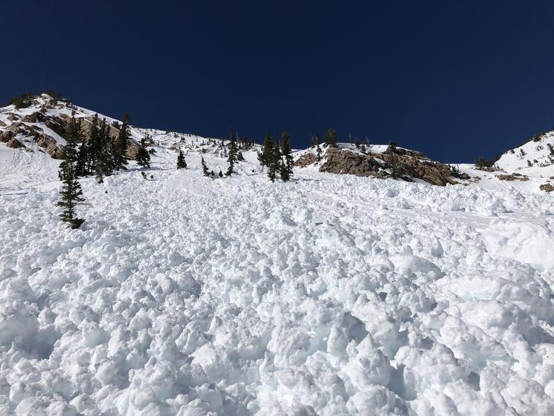 In addition, if you overstay your welcome on steep terrain facing the south half of the compass you have the possibility of triggering a wet sluff that may entrain more snow than you might expect. As the day wares on you'll wanna avoid deep gullies and road cuts where cement-like debris has no place to fan out and can pile up a surprisingly deep amount of wet, manky, cement-like debris. If you're feeling like an ant under a magnifying glass so is the snow. As the day heats up, simply get off of and out from under steep, sun baked slopes.
