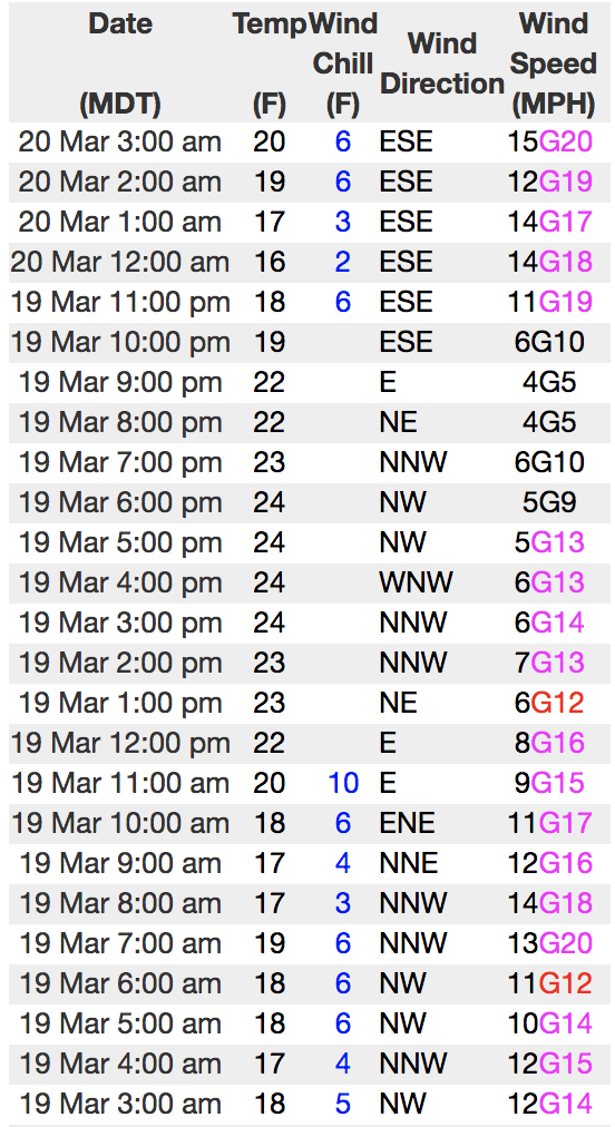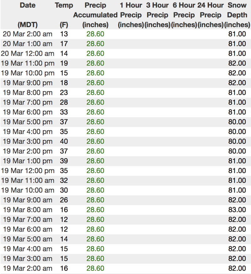 Above is hourly data from Trial Lake (9,945') and Windy Peak (10,662'). To view more regional weather stations click here.