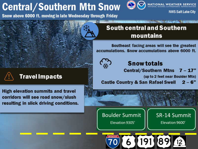 Dang... the storm dives south. But fear not.... our turn(s) is coming. Look for increasing clouds today, temperatures rising into the 40's, and southeast winds bumping into the 30's along the high ridges. The storm affects southern and central Utah today, though we should get in on the action late tonight and tomorrow. Hit or miss storminess continues Thursday and tapers off Friday afternoon, though snow accumulations are gonna be on the light side. A second storm system affects the region this weekend.
