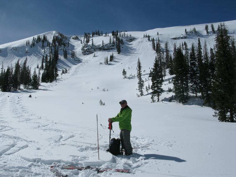 My partner for the day, world renowned mountaineer and overall B.A., Jeff Duenwald stands by a probe buried in a deep Uinta snowpack registering 205 cm. of total snow. Yup... it's a go-anywhere-base and the Uinta's are about as fat, white, and stable as they get.
