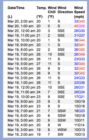 Above is a 24 hour data dump from Windy Peak (10,662') showing recent wind trends.