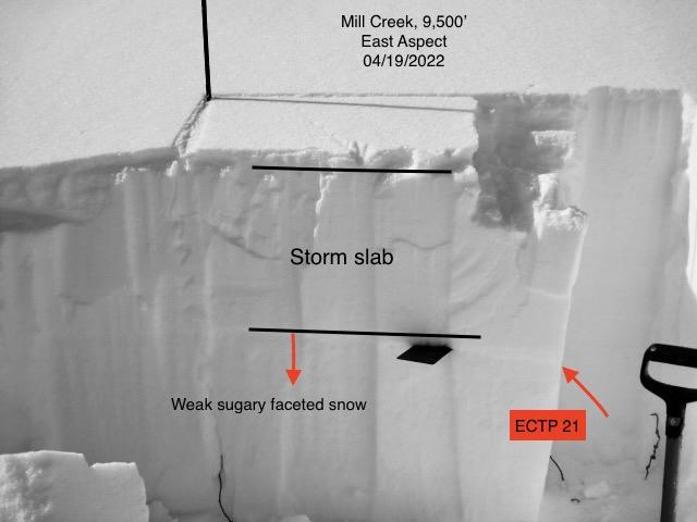 Ted's image above from his travels Friday around Millcreek illustrate our problem, a persistent weak layer (PWL) buried underneath about 2 feet of snow. It's a stronger snow on weaker snow combo and that setup is causing the increase in avalanche activity. And while recent warm weather is helping our new problem child adjust, gain a little strength, and become happy in its own skin, it hasn't gone away. What this means is that the likelihood of triggering an avalanche on this layer has decreased somewhat, but we know the safest approach is to assume the PWL remains guilty until proven otherwise.